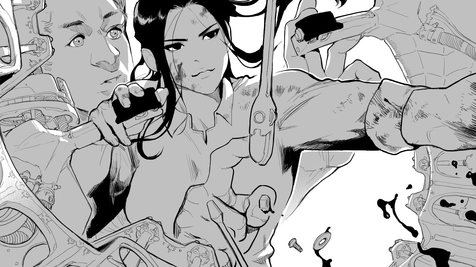 어쨌든 실패를 감지하고 나서 이 그림을 어떻게 살릴까 고민하다가 사람을 하나 더 넣어주면 좋겠다고 생각했고, 처음에는 예쁜 여자를 한 명 더 추가할까 하다가 남자로 변경, 거기에 몸집까지 엄청 키워주면 '자기가 직접 구멍에 들어갈 수 없어서 덩치가 작은 엔지니어에게 부탁하는' 상황을 그림에 서사로 녹일 수 있겠다 싶어서 새 구상으로 작업을 재개했다. 실제로 남자 얼굴과 손만 더 들어가는 구상이라 어렵지는 않았고 어찌어찌 작업은 마치게 되었는데, 깊이감이 꽤 필요한 작업임에도 밀도가 낮은 기계 디자인 때문에 느낌이 안 살아서 몸을 베베 꼬며 괴로워하다가 우선 동영상은 원본으로만 만들고, 그 위에 톤을 넣은 버전도 그려보았다.