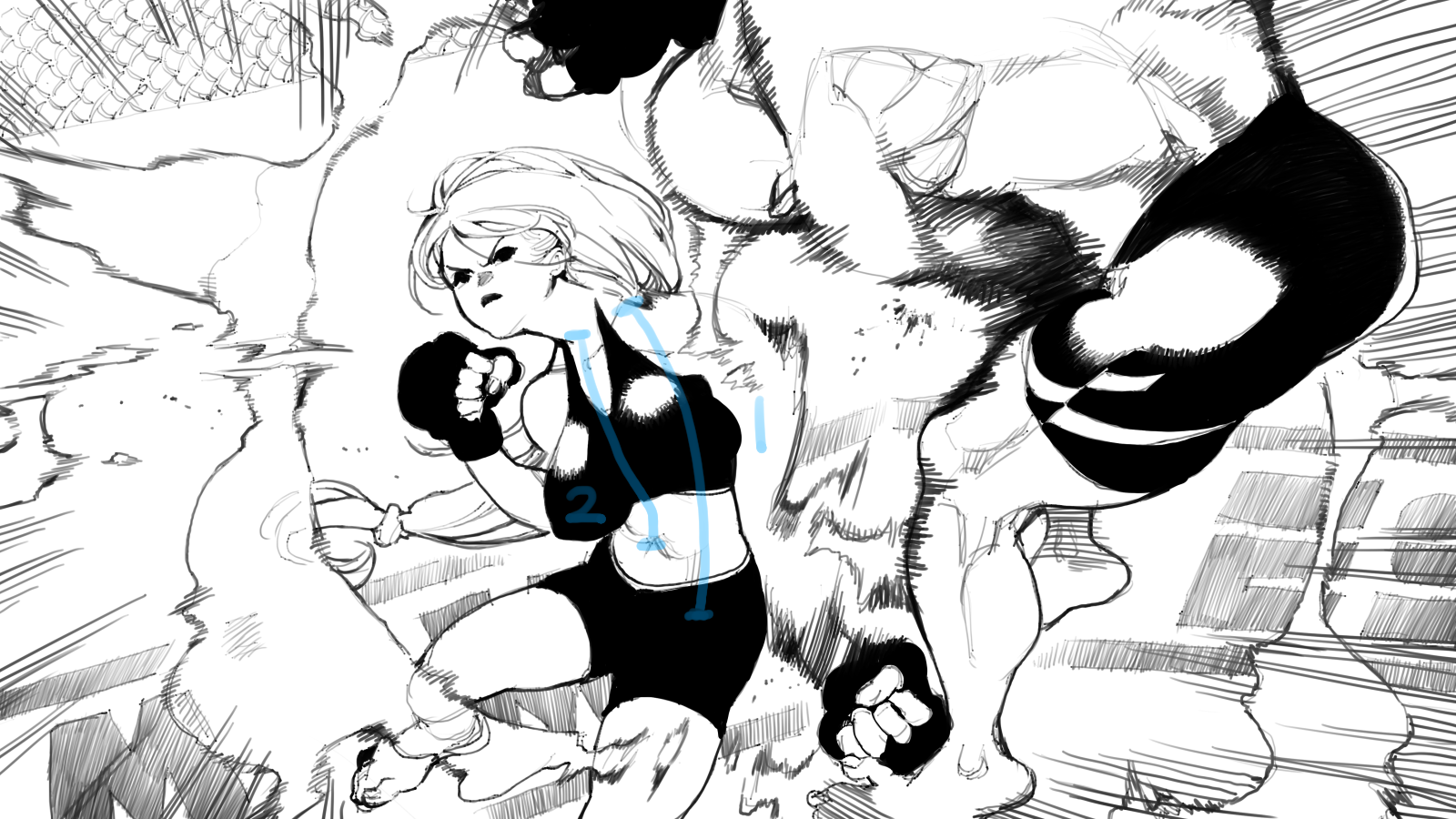 그리고 나면 별거 아닌 것처럼 보이는데 막상 구상할 때는 너무 어려웠다. 실제 경기에서는 어퍼컷을 쳐도 타격 이후에 무게중심이 크게 변하지 않고 손도 거의 제자리를 유지하지만, 그림에서는 펀치머신을 치듯 풀파워로 휘둘러서 디딤발이 뒷발로 변하는 느낌 + 타격한 손은 튕겨서 내려간 느낌을 주고 싶었다. 그런데 막상 그리려고 해보니 분명 수평 위치에서 보면 옆구리는 잔뜩 웅크렸는데 2번처럼 흉곽은 열려서 등은 뒤로 휘면서 1번 선이 가장 앞으로 돌출하는 느낌을 주어야 했고, 이런 전체적인 개념 자체가 너무 복잡했다.